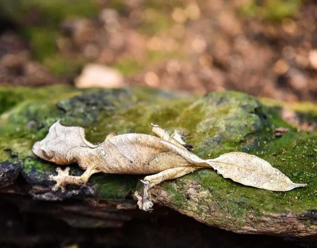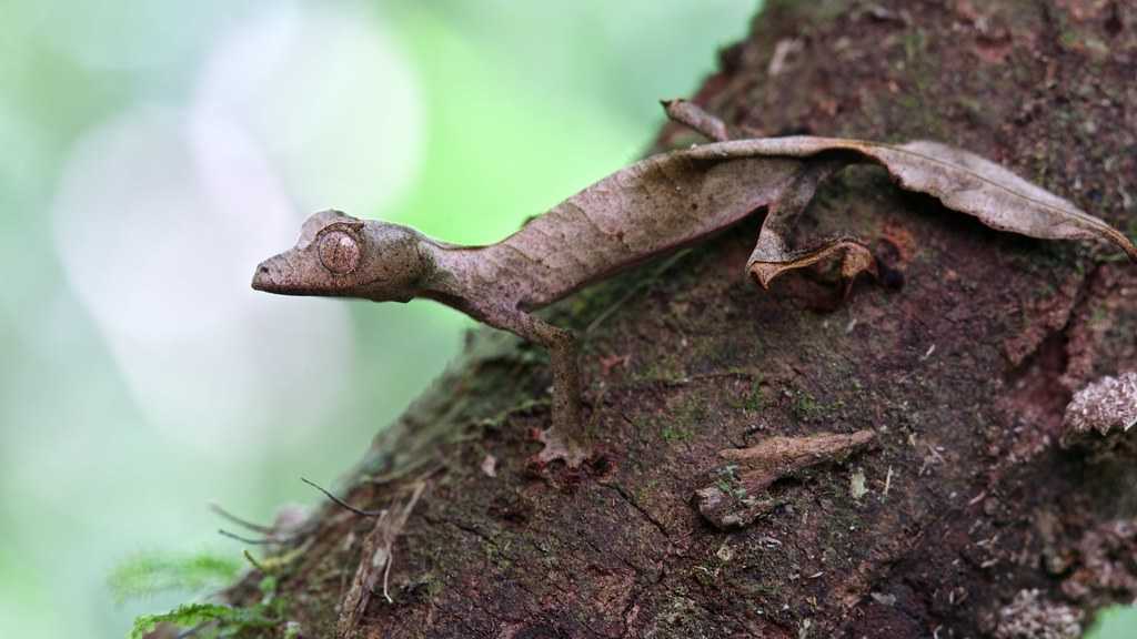 Uroplatus phantasticus (фантастичный плоскохвостый геккон) – вырастает до 9-14 см. По внешнему виду напоминает опавший сухой лист. Окраска варьируется от желтоватого до гвоздичного цвета.