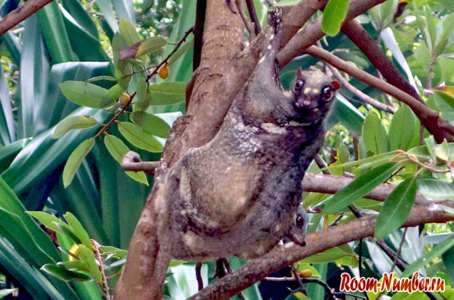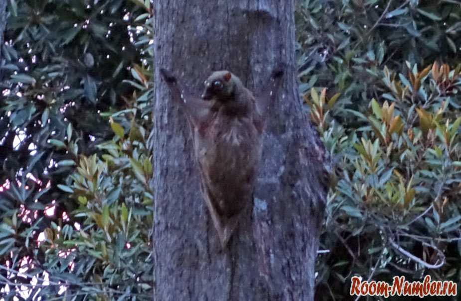 Очень интересный зверек. Большой, похож то ли на гиганскую летающую белку, то ли на огромного лемура. Размером с крупную собаку. В полете расправляет перепонку и парит, крыльев нет. Приходит на деревья по вечерам, кушает листья и плоды, перелетает с одно дерева на другое. Такого зверя видели впервые.