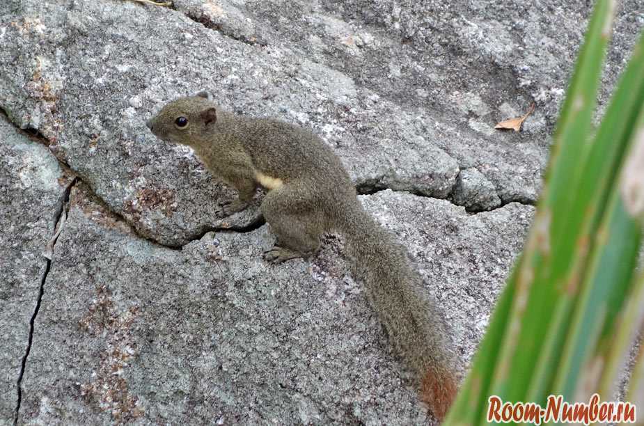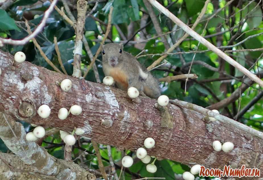 На острове белок множество. Ползают по деревьям, по крышам, по дорожкам, приходят в рестораны. По утрам любят приходить на веранду и клянчить что-нибудь пожевать. Мы покормили всеядных белочек чипсами.